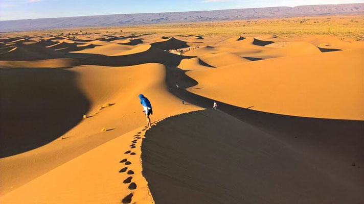 Después de cruzar varios ouad y desierto de piedra llamado hammada, llegamos a Erg Chegaga, el mar de arena, con dunas de hasta 300 mts de altura y 40 km de