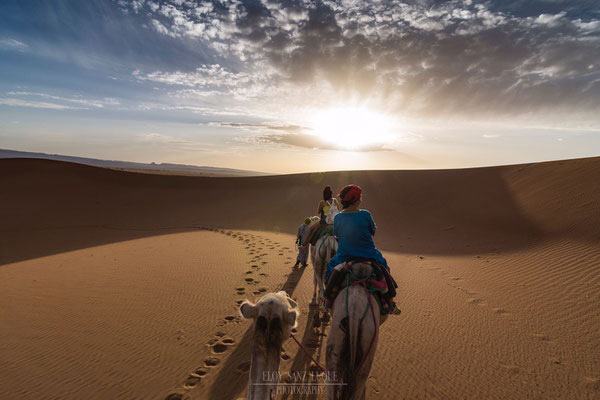 Disfrutaremos de una espectacular puesta de sol a lomos de un dromedario entre las dunas y degustaremos una cena típica de la gastronomía marroquí. Alojamiento en